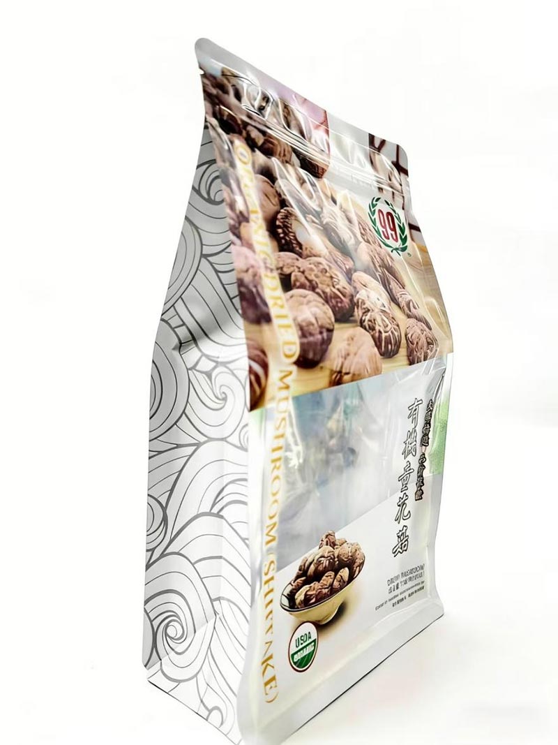 Pilihan pembungkusan secara langsung memberi kesan kepada penyimpanan dan persembahan buah-buahan kering. Jenis pembungkusan utama yang terdapat di pasaran termasuk meterai tiga sisi, meterai empat sisi, kantung berdiri dan beg meterai lapan sisi. Di antara ini, beg meterai lapan sisi adalah pilihan utama. Berbanding dengan jenis beg lain, beg meterai lapan sisi mempunyai lapan tepi tertutup, membolehkannya berdiri tegak dengan bahagian bawah rata, menjadikannya sesuai untuk dipamerkan di rak kedai. Jenis beg ini menyediakan lima bahagian untuk penjenamaan dan boleh disesuaikan dengan pelbagai grafik, menjadikannya sesuai untuk kedua-dua runcit dan e-dagang.